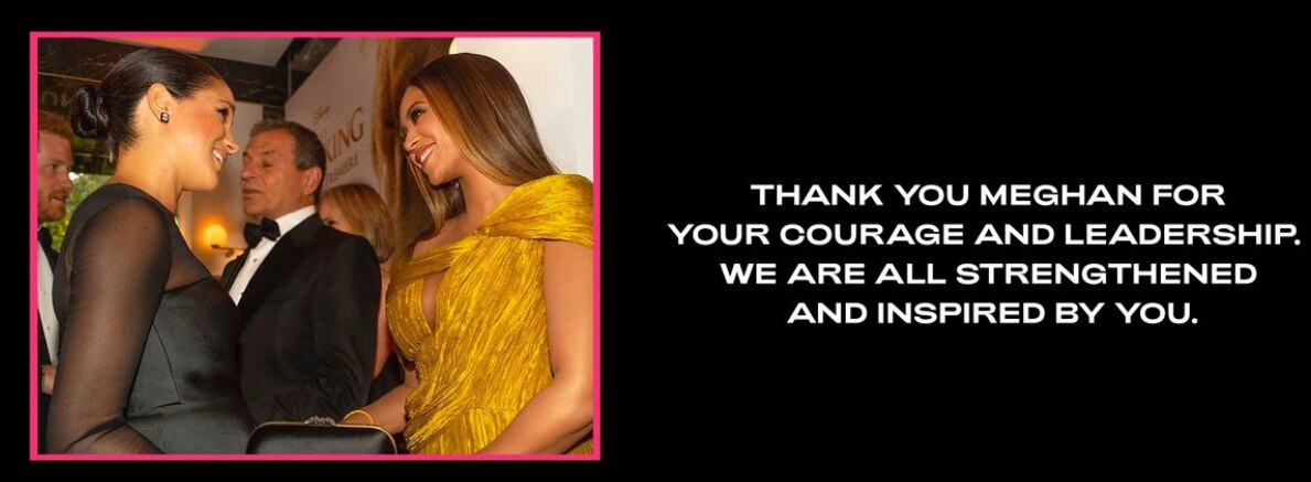 Sharing a picture of the pair meeting for the very first time, along with their husbands, at the London premiere of The Lion King in the summer of 2019, Beyonce wrote, "Thank you Meghan for your courage and leadership. We are all strengthened and inspired by you (sic)."